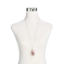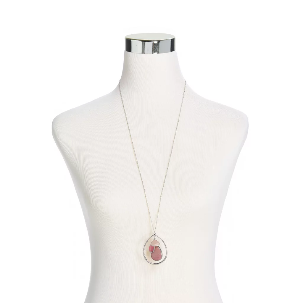 This pendant with clustered stones & cat’s eyes stands out on a long, delicate chain.