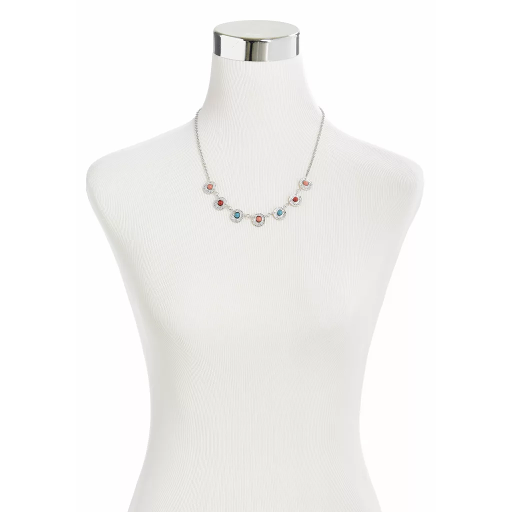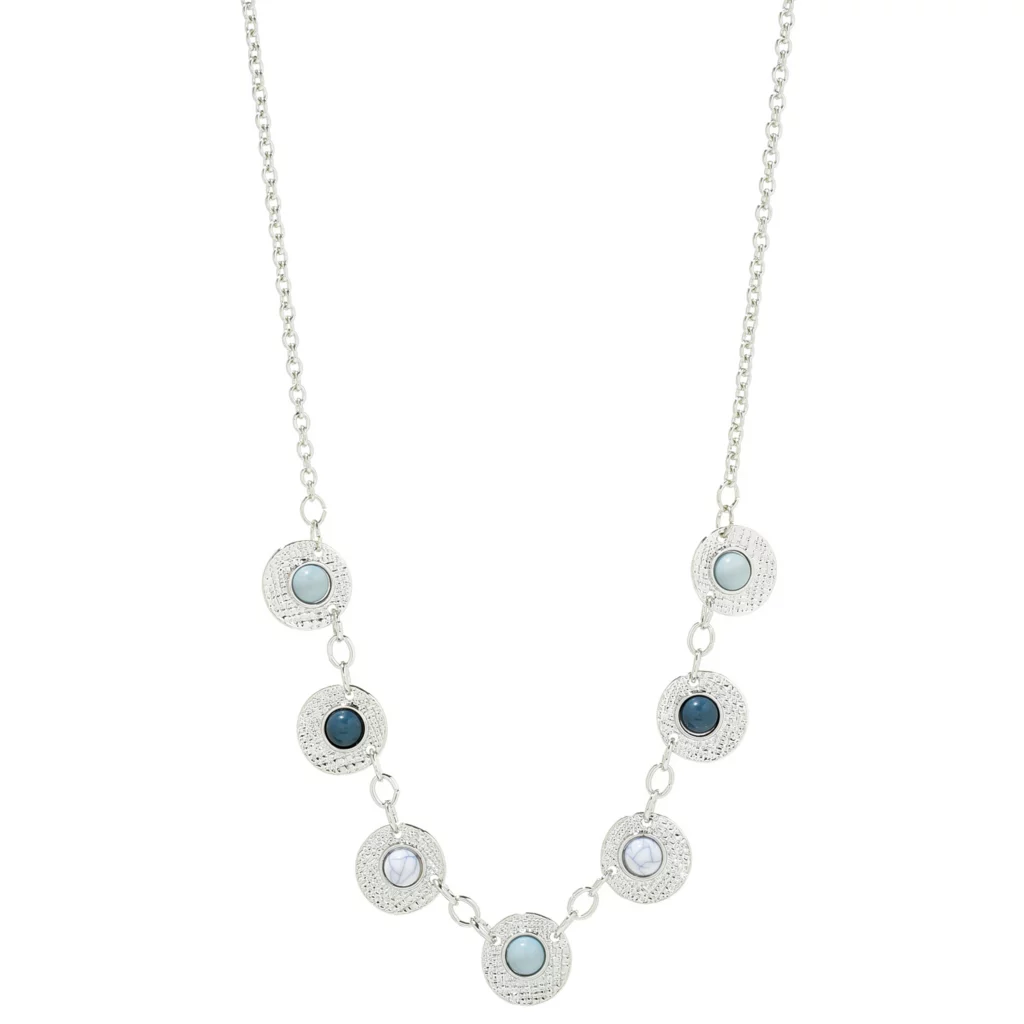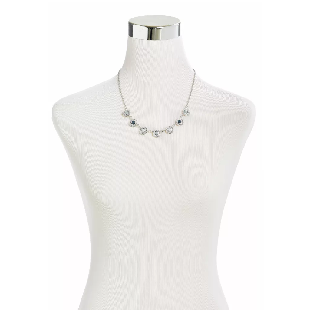 This medium length necklace has a boho feel with small beads encircled in textured discs.