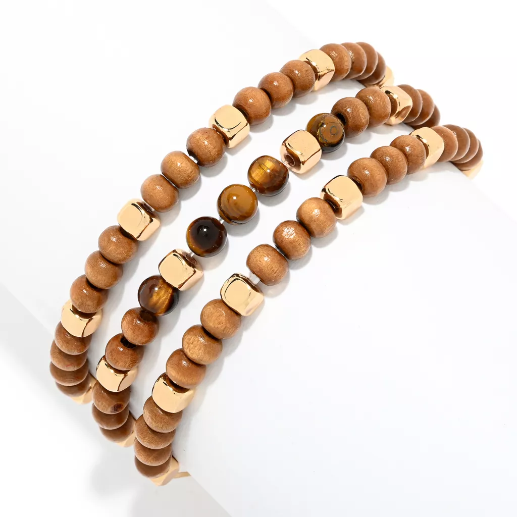 Stretch bracelets are an easy piece to add to your collection. No clasp to worry about—just slip it on and go! The mix of metals and tigers eye beads gives a beautiful neutral everyday look!