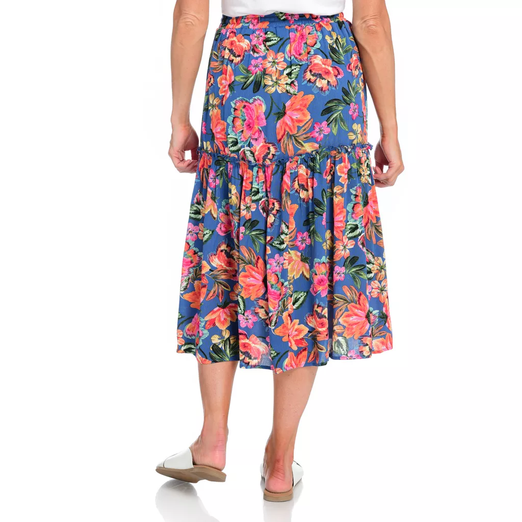 Get the best of summer style in this tiered skirt. The bold print in beautiful colors is fun and flattering; easy to pair with a Perfect Tee. The elastic waistband with a drawstring lets you choose where the waist sits.
