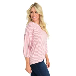 Take on the day in feminine fashion! 3/4 length bishop sleeves with elastic cuffs create a draped shape featuring flattering vertical stripes. So soft to the touch, you’ll want to wear it all the time—with denim, skirts and crops!